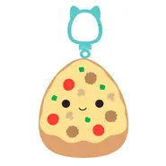 Pep is a cheesy yellow pizza slice. He is decorated with various toppings represented by large, red circles and small green cubes. He has a brown crust which appears as a stripe at the base on the front, and covers his back half. He has round, black eyes and a red, smiling mouth.